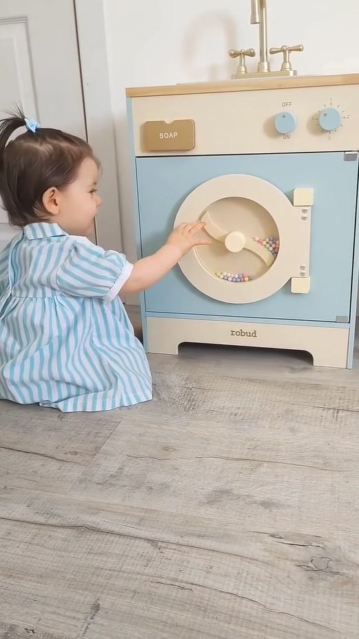 🐋REALISTISCHES DESIGN: Diese Waschmaschine ist so gestaltet, dass sie eine echte Waschmaschine simuliert. Ihr niedliches Aussehen, zusammen mit den manuell beweglichen bunten Perlen am Waschmaschinenfenster, ahmt die rollende Bewegung einer Waschmaschine nach und fesselt visuell die Kinder. Sie wird mit einem Wäschekorb, Seife, Bleichmittel und Waschmittel geliefert, was das Spielerlebnis verbessert. Darüber hinaus verfügt sie über eine Bügelfunktion, die der Waschmaschine Vielseitigkeit verleiht.